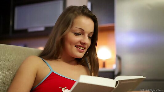 Busty curly brunette with big boobs fucks on couch